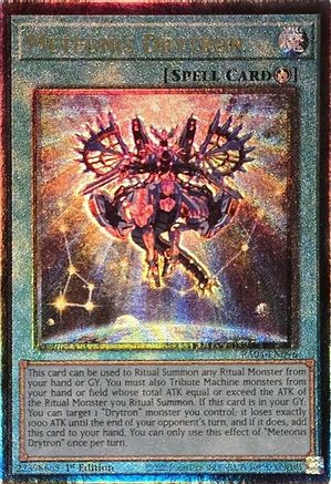 This card can be used to Ritual Summon any Ritual Monster from your hand or GY. You must also Tribute Machine monsters from your hand or field whose total ATK equal or exceed the ATK of the Ritual Monster you Ritual Summon. If this card is in your GY: You can target 1 "Drytron" monster you control; it loses exactly 1000 ATK until the end of your opponent's turn, and if it does, add this card to your hand. You can only use this effect of "Meteonis Drytron" once per turn.