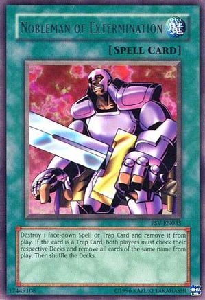 Destroy 1 face-down Spell or Trap Card and remove it from play. If the card is a Trap Card, both players must remove all Trap Cards of the same name from their respective Decks and remove them from play. The Decks are then shuffled.